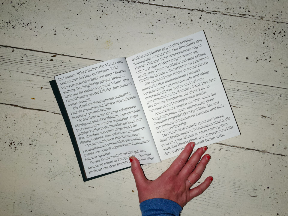 Im Sommer 2020 wurde das Haus, in dem ich in Berlin Kreuzberg wohne, an eine Schweizer Pensionskasse verkauft: Niemand wusste, ob uns damit die Kündigung drohte. Es folgten Nachbarschaftstreffen, Schildermalen, Demos… Der Versuch, das Haus mit einer Genossenschaft zurück zu erwerben, scheiterte. Mein Nachbar, der Fotograf Marvin Zilm, portraitierte die Hausbewohner:innen und veröffentlichte das Buch Ohlauer Ecke Wiener Straße. Ich schrieb die Texte.